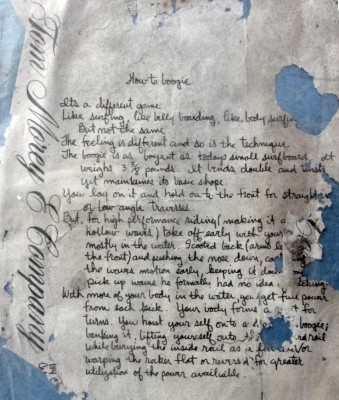 a different game.How to Boogie. Like surfing, like belly boarding, like body surfing. But not the same. The feeling is different and so is the technique. The boogie is as boyant as todays small surfboard. It weighs 3 5/8 pounds. It bends double and twists yet maintains its basic shape. You lay on it and hold onto the front for straight or low angle traverses . But for high performance sliding (making it ... hollow waves) take off early with your (body?legs?feet?) mostly in the water. Scooted back (arms ... the front) and pushing the nose down, co... the waves motion early, keeping it down ... pick up ... pick up waves he formally had no idea of catching. With more of your body in the water, you get full power from each kick. Your body forms a (??) for turns. You hoist yourself onto a (...) boogie; banking it, lifting yourself onto (??) rail while burying the inside rail as a (??) warping the rocker flat on turns for greatest utilization of the power available. |