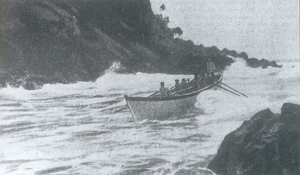 Note the lookout standing in the stern who watches for a 'safe' wave before entering the bay." Allward,
