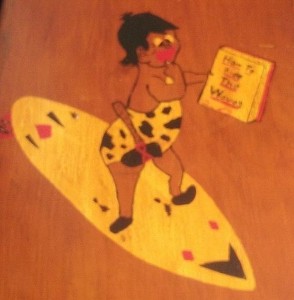 Okinuee Nose Decor, 1957. Book title reads How to Ride the Waves. Twin D-Rounded keel Fins