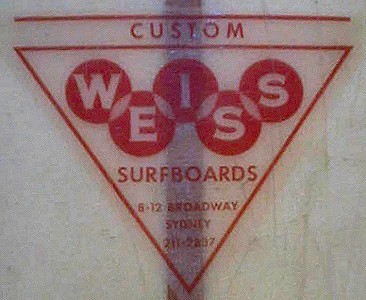 1963 - 1966 Retail: 8-12 Broadway Sydney, Phone : 211 - 2837 Factory: 110 Renwick Street, Marrickville. Several shapers, including Bob (Hansen?) from Cronulla, glassing by George Leslie. Left: Weiss Surfboards Custom Decal. 7 ft 7'', markings : Johnson 399 Decal and board details contributed by Donna Gardner, with thanks. This board's length is unusual for the period, and is probably a juvenile model. Weiss (Pty. Ltd?) was a large sporting goods retailer in central Sydney, in competition with the nearby Mick Simmons outlet. As well as the sporting goods stores, large numbers of boards were also produced for other major retailers, such as Nock and Kirby's Surfboards Bombora model (a hardware chain store and manufactured by Scott Dillon Surfboards), and department stores Walton's, the Maru model, and Farmer's. For shop display, the boards invariably featured colour decor. This was a boom period for Sydney manufacturers, these orders ran a as big as 300 units, and ding repairers became shapers over night. See Contact Production Boards, 1960s. Bob Niblock noted: Weiss as