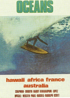 Rod Sumpter Locations: England, France, Morocco and the 1968 Puerto Rico World Contest. River Severn and Bay of Fundy Tidal Waves. Surfers: Wayne Lynch,Ted Spencer, Nat Young, Keith Paull, Fred Hemmings Corky Carroll, Margaret Godfrey. Rod Sumpter The poster flips Dr Don James' 1965 photograph of Rusty Miller, turning the Sunset Beach peak into a left-hander. |