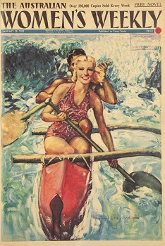 Magazine Number 242, January,1971. 32 Walsh Street, Melbourne, Victoria, 3000 Box 1292K GPO Melbourne, 3001. Telephone 30 0241. "Surfing's Origins", pages 32 and 33. A selection of early photographs reproduced from: Margan and Finney: An Pictorial History of Surfing. The cover is accredited on the contents page: "Our Cover Boy The young man trimming along a shorebreak on the cover of this month's Parade is "Butch" Cooney. The painting was done by Parade cover artist Tom Bishop from an action picture taken by Sydney photographer Jack Eden at the Newcastle, NSW, surfing championships. It appears in A Pictorial History of Surfing. See Page 32." |