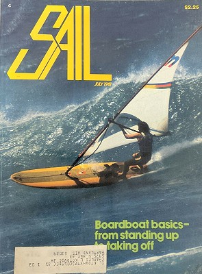 | Sail Magazine USA? July 1981 Boardboat basics - from standing up to taking off. Rare cover shot of a sailboard (boardboat) surfing a wave, probably in Hawaii. |